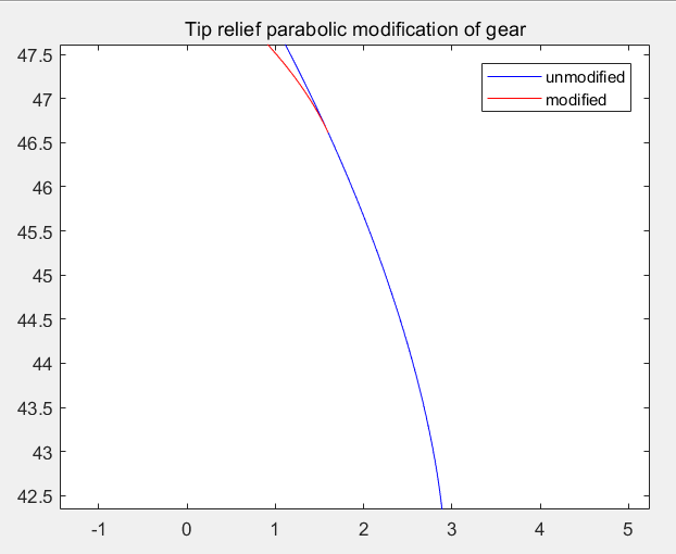 Because MATLAB can import and save data from a .mat file by using a single command, this is helpful if you want to do analysis on previously recorded data. So it is very simple and convenient to apply the modification codes to the established gear models to obtain the modified gear models. As mentioned in chapter two the perfect involute tooth profile is made up of a series of nodes, the first step is to save the modified profile’s coordinates to two variables and save the two variables in a new ‘.mat’ file called ’ fianco_completo_P (G)’ (note: P for pinion, G for gear ), then load the new mat file instead of ‘new_coordinates’ on the gear model’s file, finally execute the codes again the modified gear models are obtained: