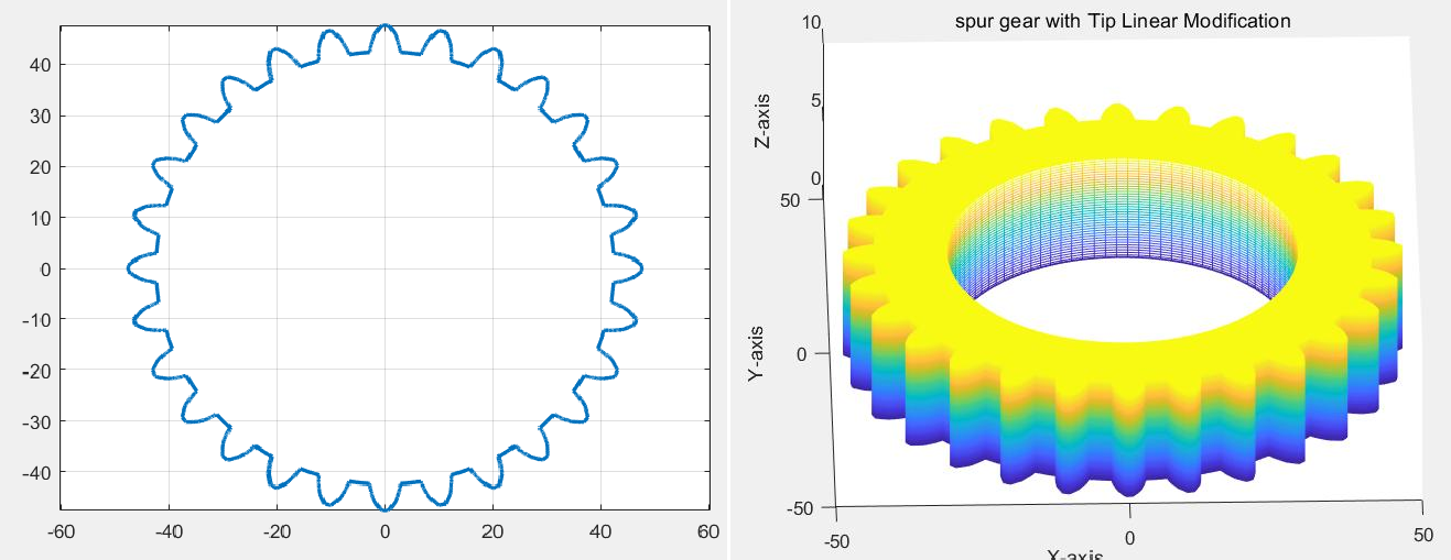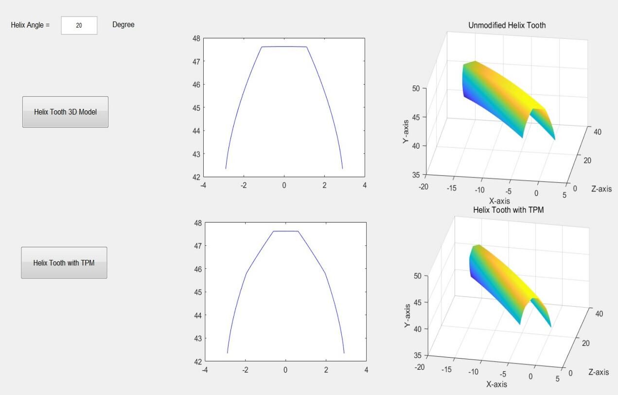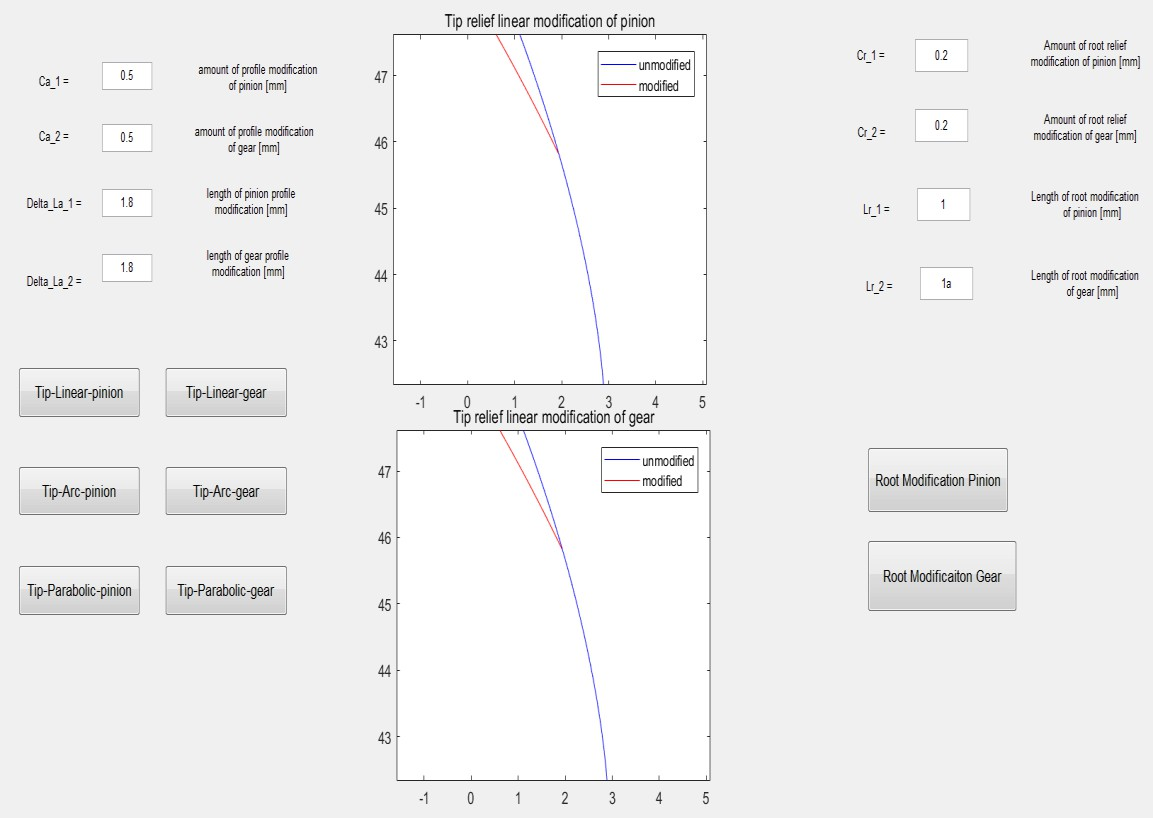 Keywords: Gear modeling, involute tooth profile, MATLAB programming, tooth profile modification, tip and root relief, crown relief, gear noise reduction, transmission error, graphical user interface (GUI), mechanical transmission system.