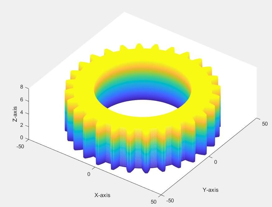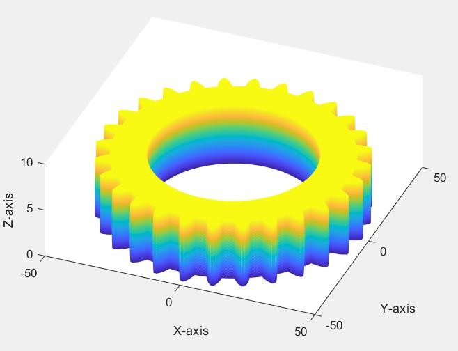 Spur gear is a gear wheel with teeth projecting parallel to the wheel’s axis which transmits motion between two parallel shafts. Along the Z direction, the curve of spur tooth is just a straight line , therefore the 3D model can be drawn by a simple ‘for’ cycle. Here set the length of the face width of spur tooth equals to 6.35mm as an example: