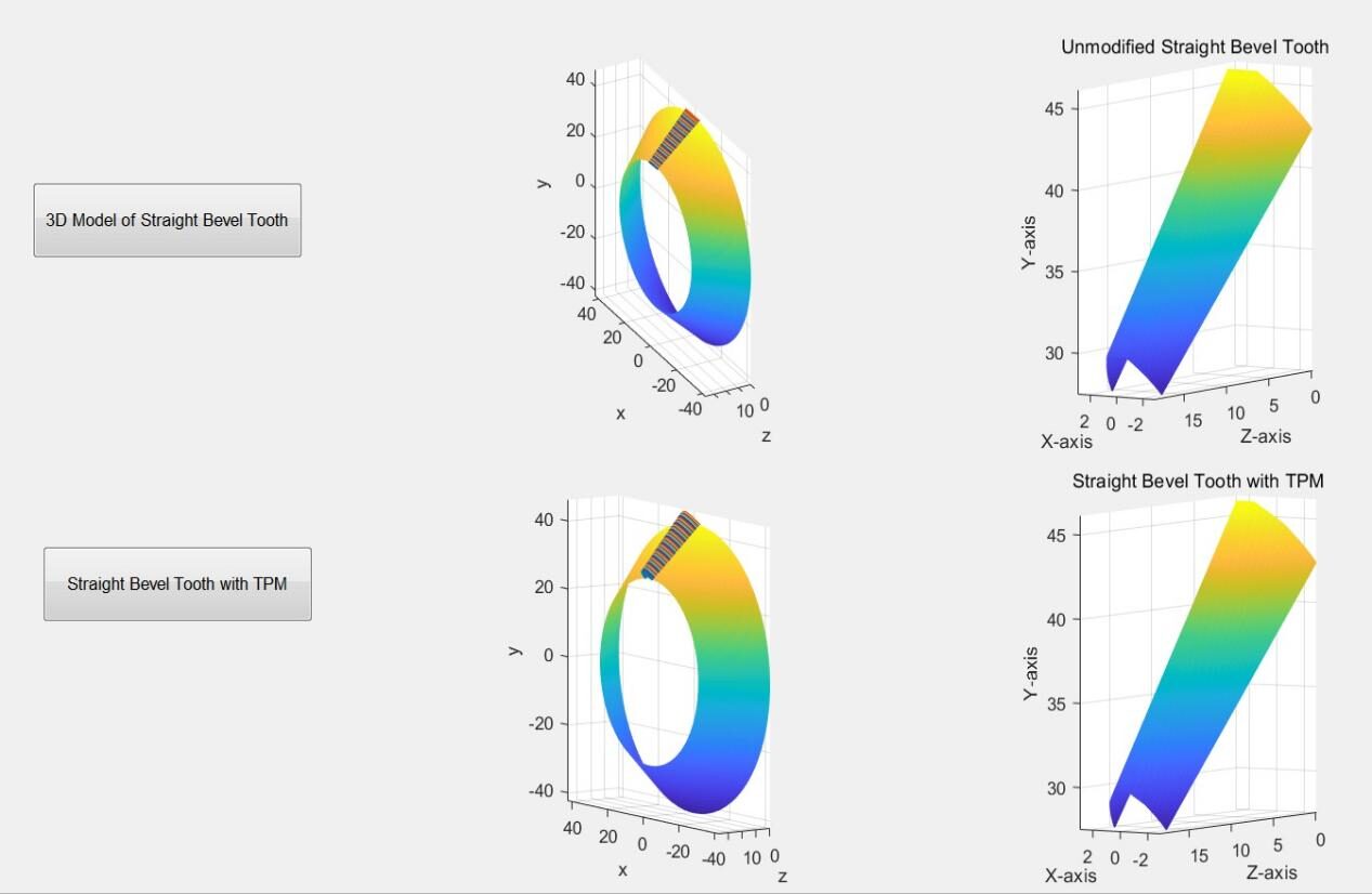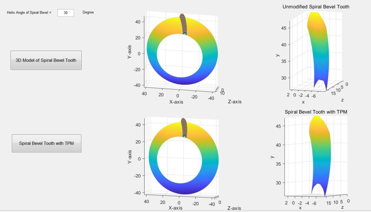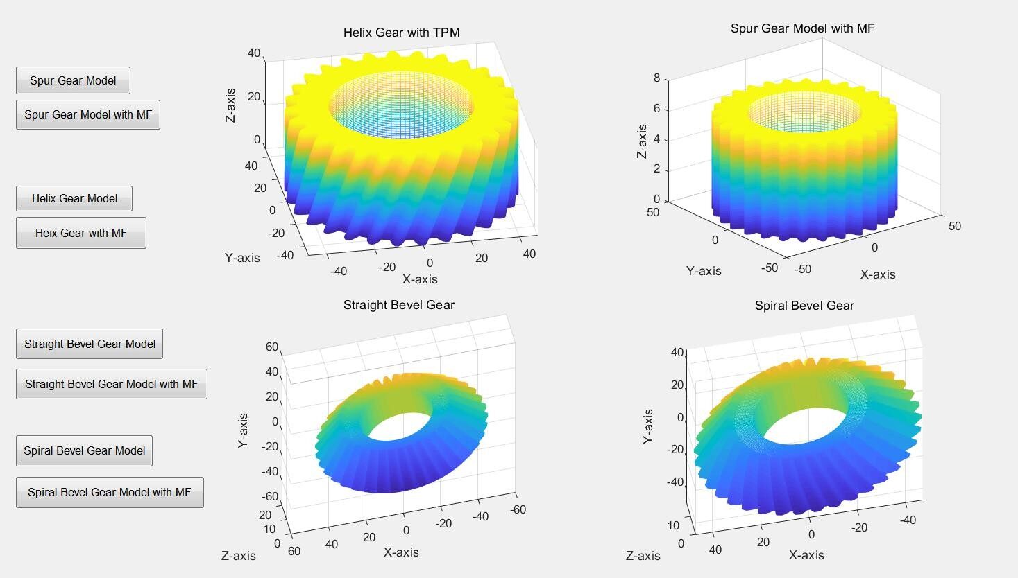 Four types of gear models (spur gear, helix gear, straight bevel gear, spiral bevel gear) are plotted by MATLAB codes and tooth profile modification is successfully implemented with the established tooth and gear models in this project, finally a GUI is designed which includes all the contents of this work for the users. To draw the gear models by MATLAB codes is difficult at the beginning. Firstly, all the functions and relationships of gear curves should be found out from mathematic and geometric point of view. Secondly, all the curves of gear models are made up of a series of nodes in matrix form, so how to handle with matrix operation like matrix addition, matrix rotation should be learnt. Thirdly, proper MATLAB programming languages and functions should be used, such as ‘for’ loop codes, ‘repmat’ function, and ‘mesh’ function etc. However, after establishing the gear model codes and tooth profile modification codes, it would be easy to do tooth profile modification on the gear models, because MATLAB can import data from .mat file. So, every time doing the TPM, just load the TPM code files to the tooth model files, the model with tooth profile modification can be obtained. MATLAB GUI is designed at last which gathers all the programming codes in a single file. GUI provide a more straight and simpler way for users to obtain gear models and to do TPM, because users just have to input and click buttons in the interface without knowing the programming codes.