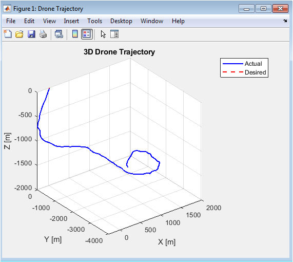 This plot provides the most holistic view of the simulation’s success. The three-dimensional visualization allows for immediate qualitative assessment of trajectory tracking performance. By overlaying the actual path (blue) onto the desired circular path (red), we can observe convergence, steady-state error, and any phase lag. A well-tuned controller will show the blue line closely following or overlapping the red dashed line, forming a smooth, stable helix in the XY-plane while maintaining a consistent Z-coordinate. Significant deviations, oscillations, or drift away from the reference path would indicate instability or poor gain tuning in the position control loop. The plot effectively validates that the cascaded controller can execute coordinated turns and altitude hold simultaneously.