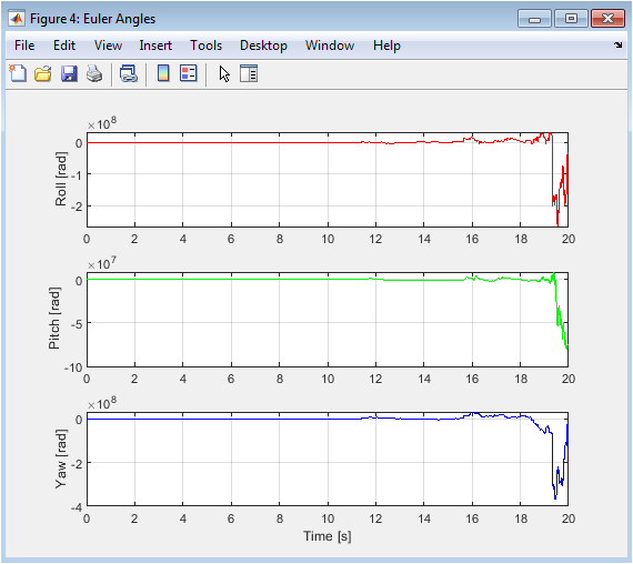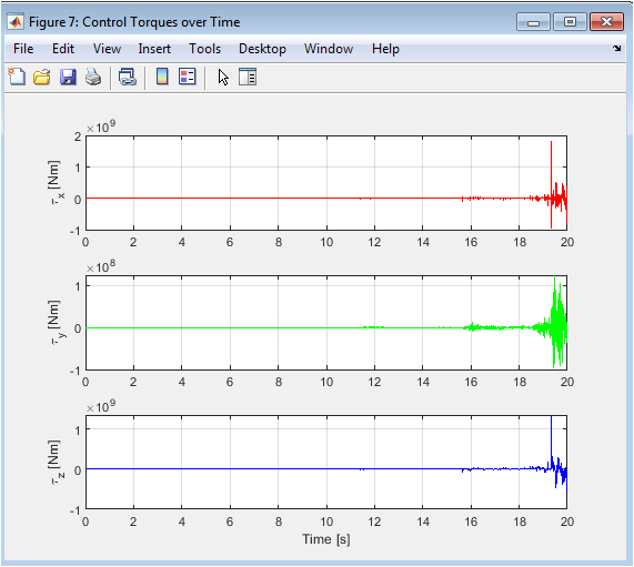 These torque histories represent the commands generated by the inner-loop controller to achieve the desired angles. They are the most direct visualization of the controller’s “thought process.” τ_x and τ_y should show active, coordinated patterns to drive the sinusoidal roll and pitch angles. τ_z should be near zero, actively correcting any small disturbances to yaw. The magnitude and smoothness of these torques are key: reasonable, bounded magnitudes indicate the gains are appropriately scaled, while smooth profiles suggest the derivative term is effectively damping the system. Chattering or saturation in these signals would be a clear indicator that the attitude controller’s gains are too high or that an anti-windup mechanism is needed for the integrator.