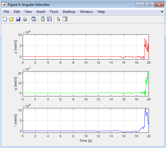 Angular velocities represent the direct output of the rotational dynamics and the input to the attitude kinematic equations. These rates are fed back as the derivative term in the attitude PID controller. The plots show how quickly the drone is rotating around its body axes. Well-behaved angular rates should closely follow the trends of the Euler angle derivatives, showing clean sinusoidal patterns for p and q during the circular maneuver, with r near zero. The absence of high-frequency noise or large, erratic spikes indicates that the control torques are being applied smoothly and that the system is not nearing its actuation limits. Noisy or unbounded angular rates would signal potential instability or insufficient derivative action.