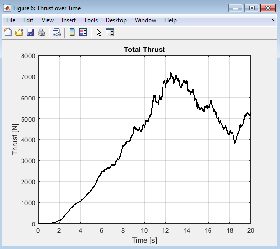 The thrust plot reveals the primary control effort for altitude and vertical acceleration. It should initially spike to overcome gravity and achieve the desired altitude, then settle to a steady-state value slightly above the drone’s weight (≈ m*g ≈ 14.72 N) to maintain hover. During the circular maneuver, minor variations in thrust occur as the drone tilts; the vertical component of the now-vectored thrust must still balance weight. A perfectly constant thrust would indicate the drone is not tilting, while excessive oscillation suggests poor damping in the altitude control channel. This signal is crucial for ensuring the commanded thrust remains within the realistic bounds of the simulated motors.