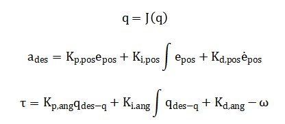 The kinematic relation connects angular rates to Euler angle derivatives via transformation matrix (J). The cascaded PID controllers compute commands: the outer loop yields or desired acceleration, from which desired roll (φ_des) and pitch (θ_des) are extracted, while the inner loop computes.