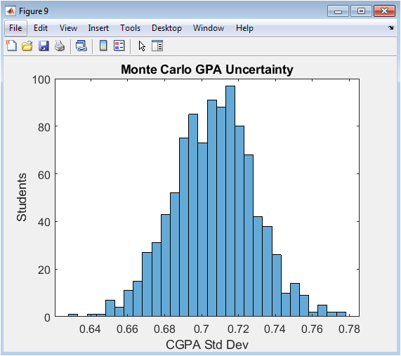 This histogram displays the uncertainty associated with each student’s CGPA, as quantified by the Monte Carlo simulation. The x-axis represents the computed standard deviation of a student’s potential CGPA outcomes across 500 noisy scenarios, and the y-axis shows the frequency of students with that level of uncertainty. A wider spread (higher standard deviation) indicates a student whose academic trajectory is volatile and less predictable. This figure reveals that not all students with the same average CGPA have equal academic stability; some have consistent performance (low standard deviation), while others have highly variable performance (high standard deviation). This is critical for nuanced advising, identifying students who may be “on the edge” and require stability-focused support.