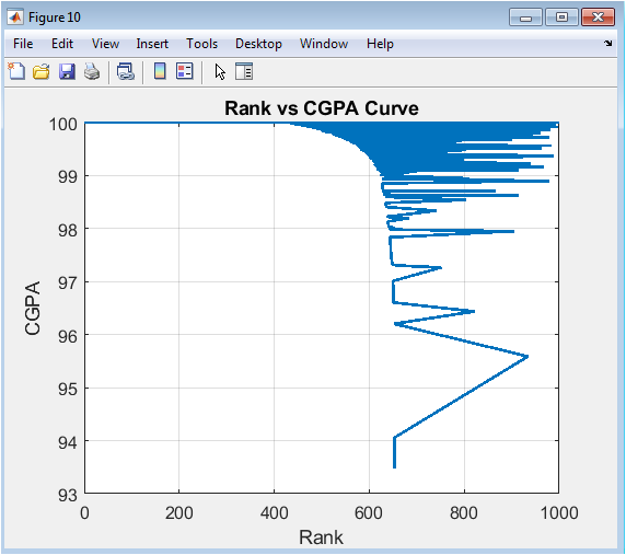 This line plot visualizes the inequality and competitive structure of academic achievement within the cohort. Students are ranked from 1 (highest CGPA) to 1000 (lowest CGPA) on the x-axis, with their corresponding CGPA on the y-axis. The resulting curve shows how steeply CGPA declines with rank. A very steep, concave curve indicates high inequality a small number of top students far outperform the rest. A more gradual, linear decline suggests a more evenly distributed performance. This visualization, akin to an academic Lorenz curve, provides a powerful summary of competitive standing, useful for setting scholarship cut-offs, understanding the tail of low performers, and analyzing the overall competitiveness of the academic environment.