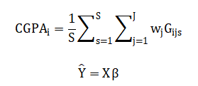 where grades (G) for student (i), subject (j), and semester (s) are functions of study hours (H), attendance (A), and aptitude (I). Cumulative GPA is calculated as a credit-weighted mean Predictive modeling uses multivariate linear regression Predictive modeling uses multivariate linear regression.