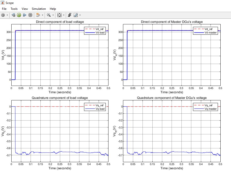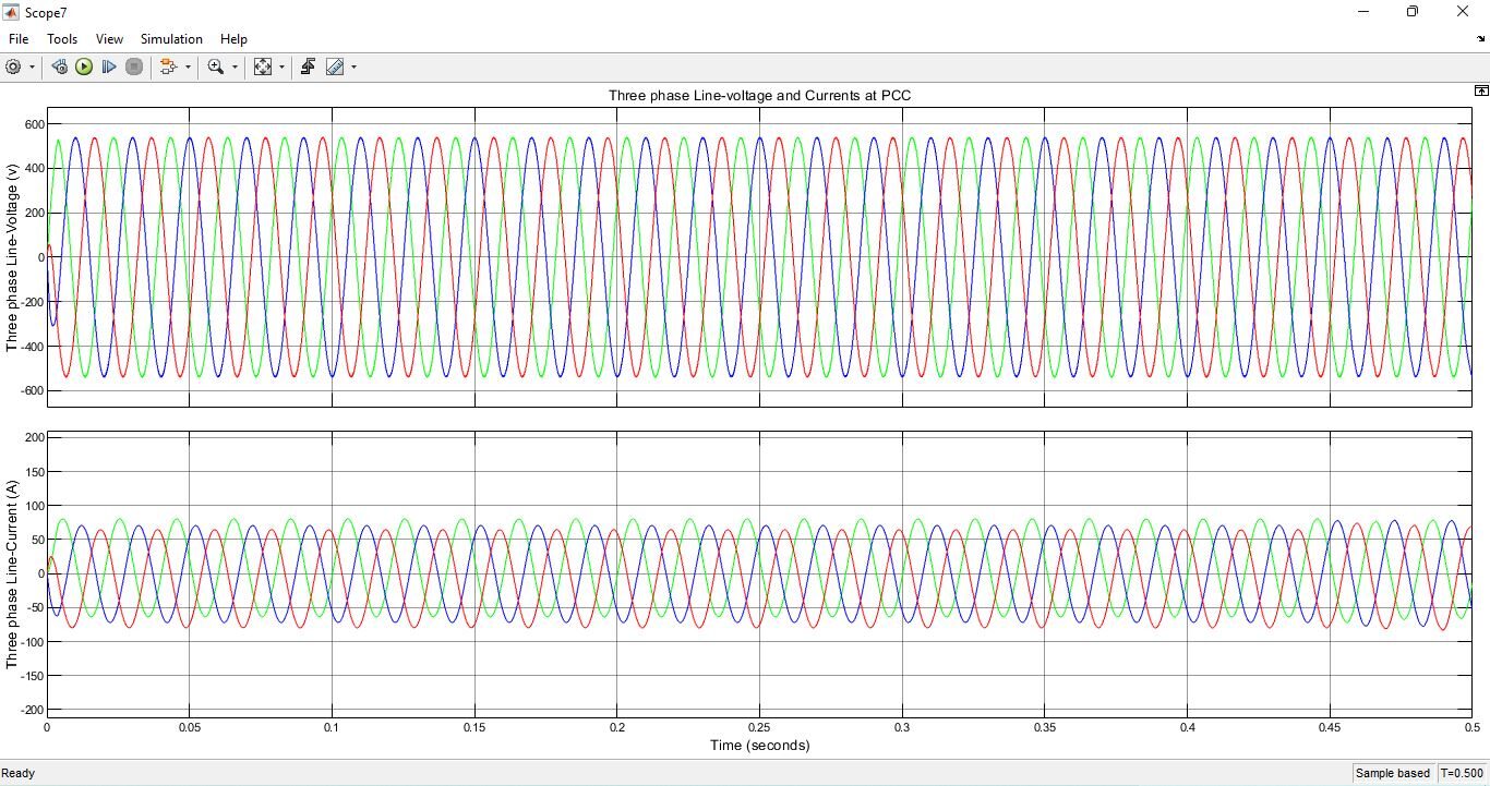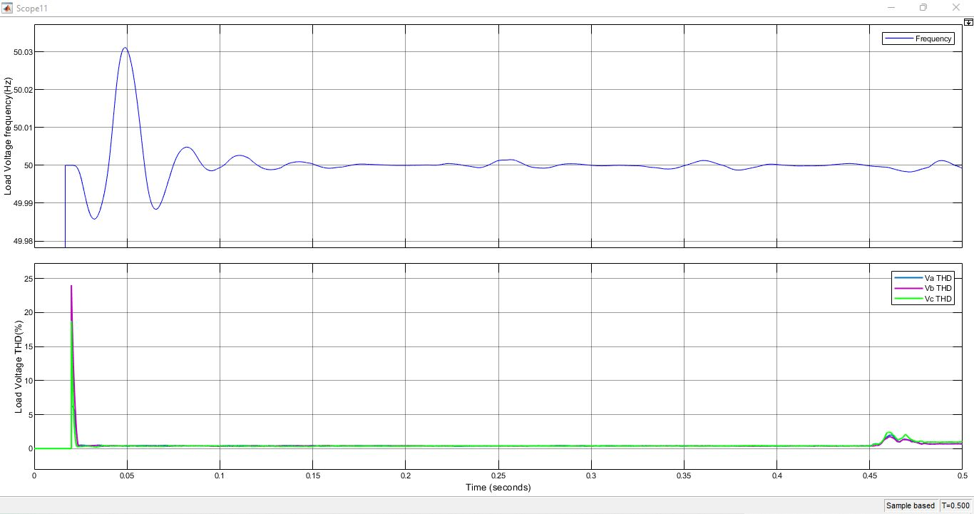 The MATLAB results of the designed system highlight significant improvements in performance metrics such as power quality, efficiency, and stability. The SMC layer ensures fast dynamic response by maintaining voltage and current regulation even during sudden disturbances like load fluctuations or PV irradiance drops. The PSO-optimized control parameters result in minimized Total Harmonic Distortion (THD), with simulations showing a reduction from values above 5% in conventional controllers to values consistently below 2%. This directly translates to improved power quality and compliance with IEEE 519 standards. The AI layer demonstrates predictive control capability by forecasting load demand up to several hours ahead with high accuracy, enabling proactive dispatch of battery storage and PV utilization. MATLAB plots of frequency response reveal that the system maintains frequency deviations within ±0.05 Hz, while voltage stability is maintained within ±2% of the nominal level across all tested conditions. Comparative bar charts between conventional PI controllers, SMC-only controllers, and the proposed hierarchical scheme further validate the superiority of the multi-layered approach, showcasing tangible performance gains in efficiency and reliability.