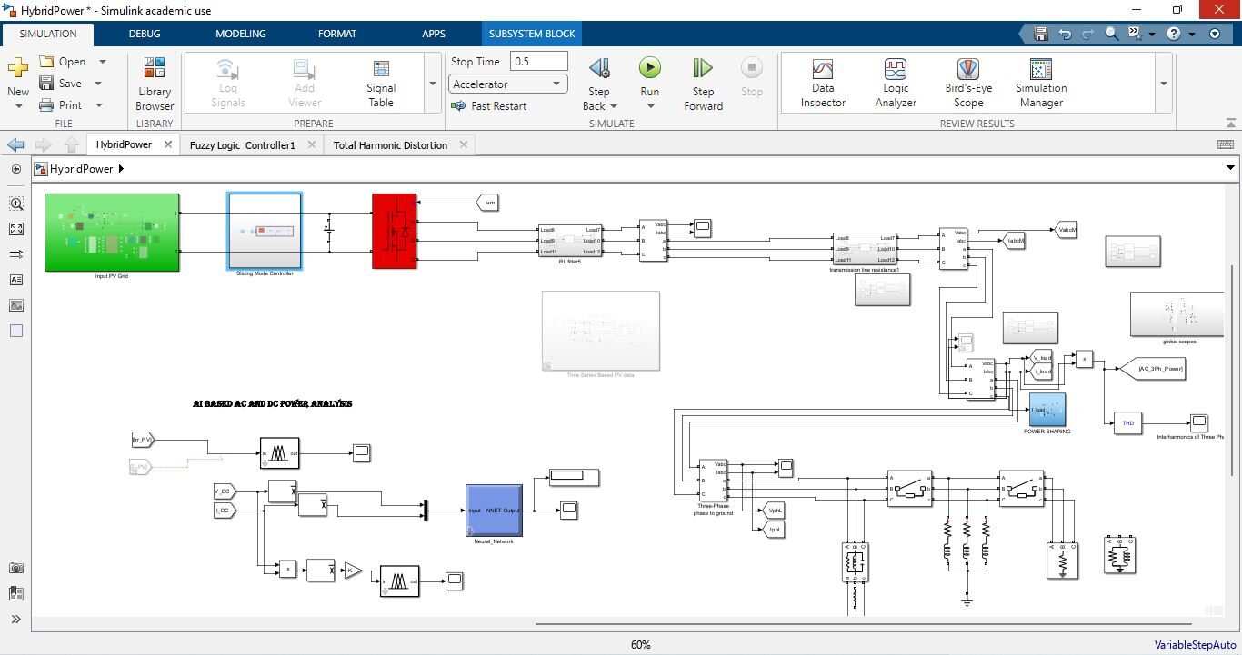 The simulation environment for this project is developed in MATLAB/Simulink due to its extensive toolbox support for power systems, control design, and AI algorithms. The hybrid system model includes PV arrays modeled with irradiance and temperature variability, a grid connection modeled with dynamic voltage and frequency variations, and energy storage units such as batteries to manage supply-demand mismatch. The SMCs are implemented using state-space models of the power converters to regulate DC-link voltage, active power, and reactive power exchange with the grid [13]. The PSO algorithm is integrated through MATLAB functions that iteratively optimize the control gains by minimizing a defined cost function, which considers voltage deviation, frequency regulation, and harmonic distortion levels. The AI layer is implemented using MATLAB’s Deep Learning Toolbox, where neural networks are trained on simulated demand and irradiance datasets to perform load forecasting and adaptive control decisions. During simulation, various operating scenarios such as grid-connected mode, islanded mode, partial shading on PV, and sudden load changes are tested to evaluate the adaptability and robustness of the hierarchical control. The simulation outputs include waveforms of voltage, current, frequency, and harmonic spectra, all of which demonstrate how the proposed control scheme enhances stability and efficiency compared to conventional methods.