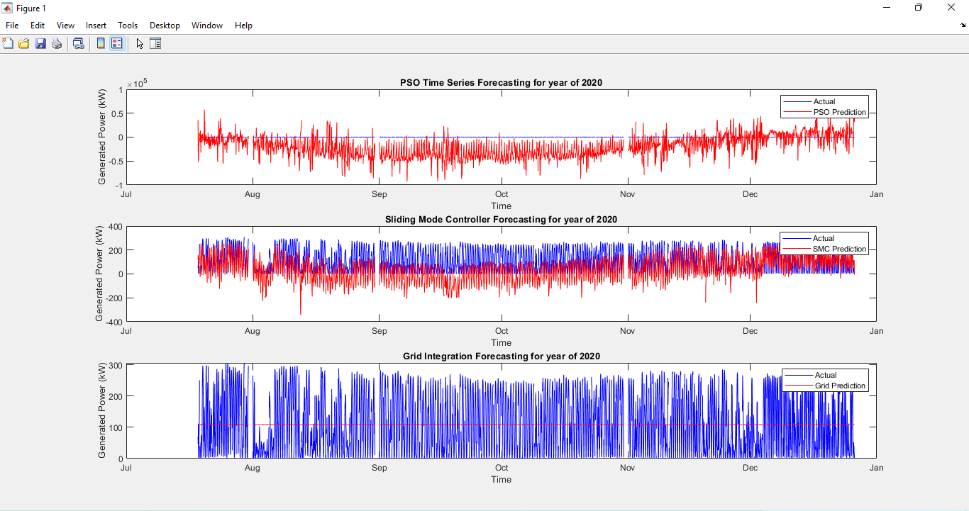 The design of this project centers on creating a multi-layered hierarchical control framework that ensures optimal operation of a hybrid power system composed of photovoltaic (PV) generation, conventional grid supply, and storage units. At the foundational layer, Sliding Mode Controllers (SMCs) are deployed due to their strong robustness against disturbances, nonlinearities, and parameter uncertainties inherent in renewable energy systems. The second layer incorporates Particle Swarm Optimization (PSO), which dynamically tunes controller parameters to achieve superior response under varying load and irradiance conditions. At the highest layer, Artificial Intelligence (AI) controllers, leveraging adaptive machine learning techniques such as neural networks or reinforcement learning, are introduced for predictive energy management and load forecasting. This design approach not only ensures stability and reliability of the hybrid power system but also creates a scalable architecture capable of integrating additional renewable sources like wind or micro-hydro in future expansions. The control hierarchy ensures that local disturbances are mitigated immediately at the SMC level, system-level optimization is achieved through PSO, and long-term adaptive planning is handled by AI, thereby offering a holistic solution to the challenges of modern hybrid power networks [17].