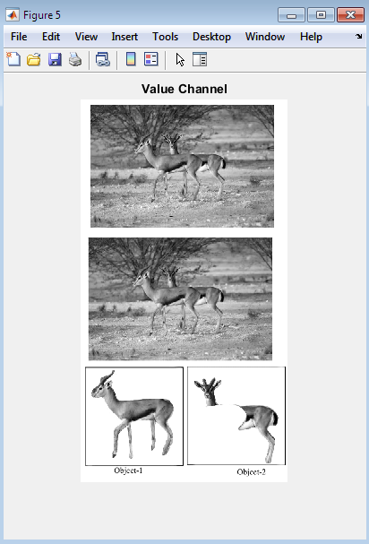 Above figure displays the Value channel of the HSV image, titled “Value Channel.” The Value channel represents the brightness or intensity of the colors in the image, with higher values indicating brighter areas and lower values indicating darker areas. In this image, the value channel provides information about the overall brightness distribution, which can be useful for particle detection if the particles have distinct brightness characteristics that differentiate them from the background or other objects. By analyzing the Value channel, one can determine if brightness-based thresholding or segmentation might be an effective approach for isolating particles in the image.