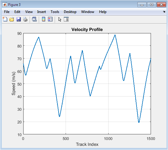 This plot figure 3 displays the curvature magnitude at every point around the circuit, with positive and negative values indicating left and right-hand turns respectively. The curvature profile reveals which corners demand the most aggressive speed reduction, with sharp peaks corresponding to tight-radius turns that become the limiting factors for lap time. Notice how the curvature varies continuously around the circuit, reflecting the parametric track generation that creates realistic corner transitions rather than simple constant-radius bends. This profile directly determines the friction-limited velocity envelope, as higher curvature values impose lower maximum cornering speeds through the fundamental relationship between turning radius and lateral acceleration. Engineers use this visualization to identify the most challenging sections of the circuit where racing line optimization will yield the greatest performance benefits.