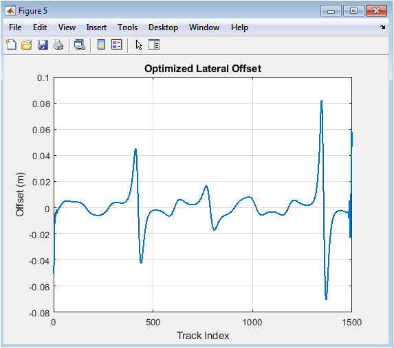 Figure 6 plot shows the magnitude and direction of lateral displacement from the centerline at each point around the circuit, representing the optimization algorithm’s final solution. Positive offset values typically indicate displacement to one side of the track, while negative values represent the opposite direction, together creating the classic in-out-in cornering line. The pattern of offset changes reveals the optimization strategy: entering corners with offset toward the inside, transitioning through the apex, and drifting to the outside at exit to maximize corner radius. Notice how offset values remain strictly bounded between the track width limits, demonstrating that the algorithm respects physical circuit boundaries while seeking the minimum curvature path. The smooth variation in offset around the circuit indicates successful convergence of the gradient descent optimization, with no abrupt jumps that would indicate numerical instability or incomplete solution.