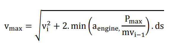 This implicit relationship is solved using fixed-point iteration, progressively updating the velocity estimate until convergence. The inclusion of the aerodynamic term ensures that higher speeds generate additional downforce, increasing tire grip and allowing greater cornering performance. Once the curvature-constrained velocity is established, a physically realizable speed profile is constructed using bidirectional dynamic programming. In the forward pass, acceleration is limited by both engine capability and available power. The propagation rule is expressed ensuring that velocity growth between successive points respects propulsion limits and aerodynamic drag effects [38].
