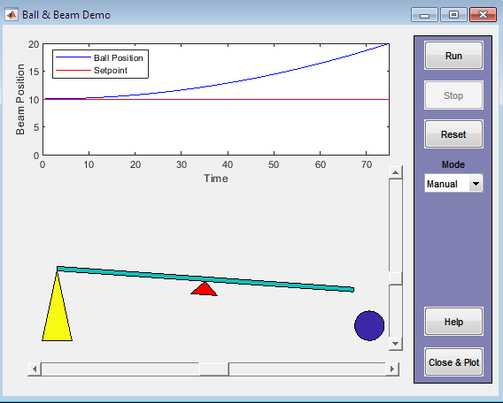 - Visualization: The simulation provides visualization tools to display the ball’s position and beam angle over time, allowing users to analyze the system’s response to different control inputs.