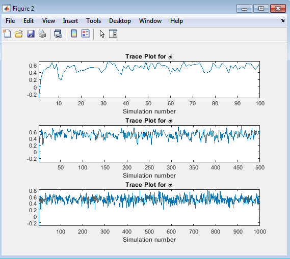 This figure presents three trace plots for the autoregressive coefficient ϕ, showing the evolution of the ϕ values over the simulation for different numbers of iterations (100, 500, and 1000). The trace plots provide insight into the convergence and mixing of the Markov chain. The trace plots in Figure 4 allow us to assess the behavior of the ϕ values over the simulation. By examining the plots, we can determine whether the chain has converged to a stable distribution and whether the values are mixing well. A well-mixed chain will exhibit random fluctuations around a stable mean while a chain that has not converged may display trends or patterns. The three subplots in Figure 2 show the ϕ values for different numbers of iterations, enabling us to evaluate the impact of increasing the number of iterations on the convergence and mixing of the chain. By analyzing these plots, we can gain confidence in the reliability of the simulation results and make informed decisions about the required number of iterations for future simulations.