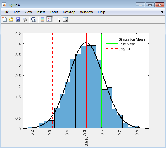 Figure 6 : Histogram of Posterior Distribution of ϕ with Simulation Mean, True Mean, and 95% Confidence Interval