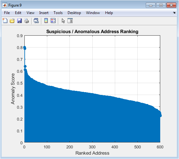 Figure 10 presents the final output of the analytical pipeline: a ranked list of all addresses sorted by their composite Anomaly Score from highest to lowest. The stem plot format emphasizes the sharp drop-off, visually confirming that only a small fraction of participants exhibit highly suspicious behavior. This score synthesizes multiple risk dimensions: connectivity (degree), economic volume (wealth), and temporal irregularity (burstiness). The top-ranked addresses represent those that are not just big or active, but are anomalously so in a coordinated walfor example, an address that is a highly connected hub, moves vast sums, and does so in erratic, concentrated bursts, a classic signature of a mixing service or exchange hot wallet.