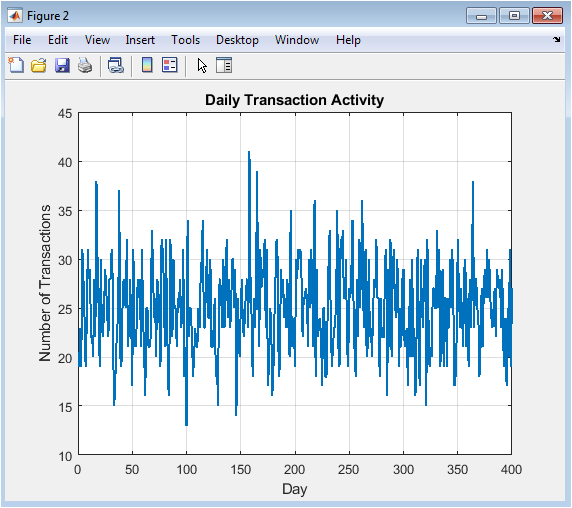 Displays the raw volume of transactions processed on each day of the simulated timeline. This time series acts as the primary gauge of overall network activity and health, revealing periods of normal operation, surges, and potential lulls. The random generation of timestamps in this simulation results in a noisy, fluctuating pattern akin to organic, uncoordinated user activity. In a real-world context, sharp, sustained spikes could indicate events like exchange promotions, token launches, or market manipulation, while prolonged dips might suggest network issues or loss of user interest. Analyzing this daily count is the first step in temporal analysis, providing context for more granular behavioral studies and helping to normalize other time-dependent metrics by accounting for overall network busyness.