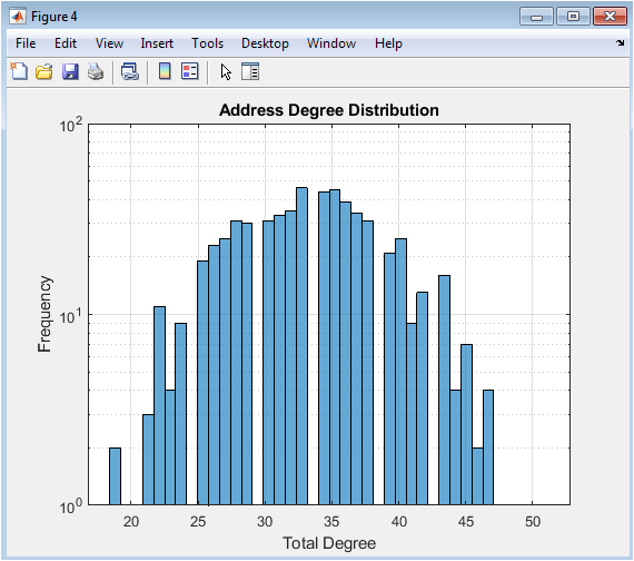 Visualizes the heterogeneity of participation by plotting the frequency of addresses with a given total number of connections (incoming plus outgoing). The use of a logarithmic y-axis reveals the characteristic long-tail, scale-free nature of the network’s connectivity. Most addresses participate in only a handful of transactions, forming the broad “body” of the distribution. A small but significant number of addresses, however, are hyper-connected hubs, forming the long “tail.” This structure is not random; it emerges from preferential attachment where well-connected addresses are more likely to attract new connections. Identifying these hubs is key, as they often correspond to exchanges, mixing services, or other critical infrastructure nodes that facilitate the majority of network flow.