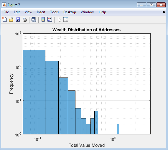 Figure 8 analyzes economic influence by plotting the distribution of “wealth,” defined as the total monetary value an address has processed (sent + received). Like Figure 2, the log-log axes confirm a power-law distribution, demonstrating extreme financial inequality. The vast majority of addresses handle negligible total value, forming the left side of the plot, while a vanishingly small number of addresses move enormous sums, creating the long tail to the right. This metric is a more direct measure of economic power than simple degree, as an address can be highly connected but move small amounts, or have few but massive transactions. The top addresses in this distribution are prime candidates for the anomaly score, representing the economic elites of the simulated blockchain.