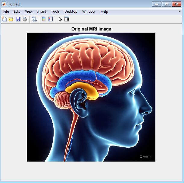 - img = imread(‘mri_image.jpg’);: This line loads the MRI image from a file named mri_image.jpg into the MATLAB workspace.