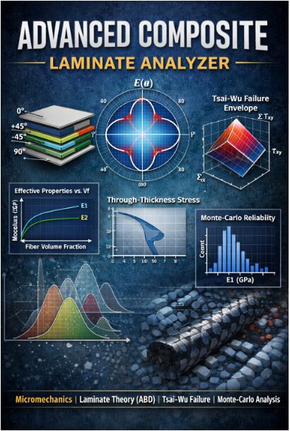 The simulation executes a deterministic-probabilistic workflow that starts with a material database, defining high-stiffness carbon fiber and a polymer matrix with their respective elastic and strength properties. The core deterministic path begins by calling a micromechanics function that homogenizes these constituents at a specified fiber volume fraction, outputting the effective orthotropic properties of a unidirectional ply. These properties are used to construct the ply’s reduced stiffness matrix, which is then transformed and integrated through a predefined symmetric laminate stacking sequence to build the full ABD stiffness matrix via Classical Laminate Theory. A specific load case of combined in-plane forces and bending moments is applied, and the system of equations is solved to obtain the laminate’s mid-plane strains and curvatures. This global deformation state is passed to a stress recovery function, which calculates the strain at each ply’s mid-plane, transforms it back into local material coordinates, and computes the corresponding in-plane stresses. Each ply’s stress state is then evaluated using the Tsai-Wu failure criterion, generating a scalar failure index to assess structural integrity. Alongside this primary analysis, the simulation runs three auxiliary computational threads. First, a parametric sweep varies the fiber volume fraction across a practical range, repeatedly calling the micromechanics module to generate curves showing the sensitivity of longitudinal and transverse moduli to this key design variable. Second, a directional stiffness module calculates the effective in-plane Young’s modulus as a continuous function of load angle, creating a polar plot that visually encapsulates the laminate’s anisotropy. Finally, a Monte Carlo reliability study introduces stochasticity by generating a large population of laminates with normally distributed perturbations to the fiber modulus, matrix modulus, and volume fraction; for each random realization, a simplified rule-of-mixtures calculates a perturbed longitudinal modulus, building a statistical histogram that quantifies performance variability. The simulation concludes by synthesizing all results into five specialized figures, providing a comprehensive visual summary from micromechanical scaling and directional properties through stress distribution and failure indices to probabilistic reliability, thereby completing a closed-loop, multi-fidelity analysis within a single script execution.