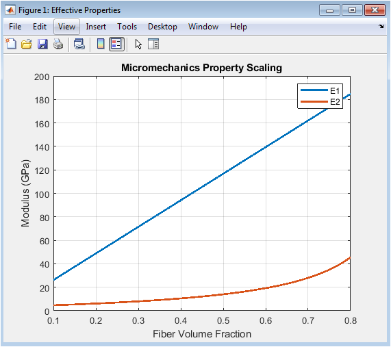 This plot visualizes the foundational principle of micromechanics how the macroscopic stiffness of a unidirectional composite ply is governed by its microscopic composition. The longitudinal modulus (E1) follows the classic rule of mixtures, shown as a perfectly linear relationship between the fiber volume fraction and stiffness, as the fibers carry the vast majority of the load in this direction. In contrast, the transverse modulus (E2) exhibits a highly non-linear, convex curve, increasing dramatically only at higher fiber fractions. This behavior reflects a more complex stress state where the softer matrix plays a dominant role, and the effective property is governed by stress concentrations around the stiff fibers. The plot clearly demonstrates the strong anisotropy inherent to composites even at the single-ply level, with E1 being an order of magnitude greater than E2 across most of the practical range. It serves as a critical design chart, allowing engineers to select a target volume fraction that achieves the necessary stiffness balance for their application while considering manufacturing constraints. The intersection of the two curves never occurs within typical ranges, underscoring the permanent directional bias introduced by fiber reinforcement.
