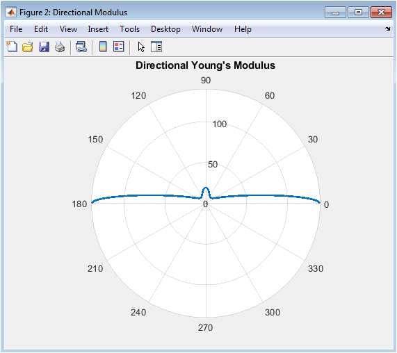 This polar plot is a powerful visual representation of anisotropy, mapping how the effective stiffness of a single unidirectional ply varies with the direction of applied in-plane load. The plot forms a distinct, elongated shape resembling an oval or a racetrack, with its major axis aligned at 0° (and 180°), corresponding to the fiber direction where stiffness is maximum. The minor axis, at 90°, shows the significantly lower transverse modulus governed primarily by the matrix. The smooth transition between these extremes is dictated by the transformation equations of an orthotropic material. This visualization immediately communicates that the material is not just “strong in one direction,” but has a continuous stiffness landscape. For a designer, this figure is indispensable for aligning primary load paths with the stiffest material axes or for understanding the severe stiffness penalty incurred when loading off-axis. If the analysis were extended to a multi-angle laminate, this polar plot would become more circular, visually confirming a more isotropic in-plane response.