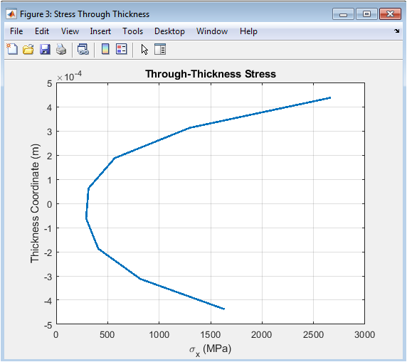 This figure reveals the internal load-carrying mechanics of the laminate by plotting the stress component in the global x-direction against the normalized thickness coordinate. The zig-zag, discontinuous profile is the hallmark of composite laminate stress analysis, arising from the changing material orientation of each ply. Sharp jumps in stress occur at ply interfaces where the fiber angle changes, demonstrating how different plies share the applied load differently based on their alignment relative to the loading direction. Typically, the 0° plies (aligned with the load) show the highest tensile or compressive stresses, while the 90° plies show much lower values, as they carry load primarily through the less-stiff matrix. The plot validates the coupling effects predicted by the ABD matrix, showing if the stress distribution is symmetric (for symmetric laminates) or asymmetric (indicating bending or extension-bending coupling). This detailed view is critical for identifying critical plies, understanding stress concentrations at interfaces, and forms the direct input for the subsequent failure analysis.