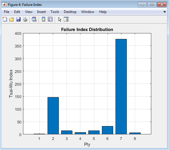 This bar chart translates the complex, multi-axial stress state in each ply into a single, actionable metric of failure risk. Each bar corresponds to a specific ply in the defined stacking sequence, with its height representing the calculated Tsai-Wu index a value of 1.0 indicates the onset of failure. The chart provides an immediate visual ranking of the most critical plies, which are often, but not always, the ones with the highest axial stress. It reveals the success or failure of the laminate design under the specified load; if all bars are below 1, the design is safe. More importantly, it shows the *margin* of safety for each ply, highlighting which orientations are under-utilized (very low index) and which are limiting the design (index closest to 1). The pattern across the sequence can indicate if failure is driven by a single weak ply or is a more distributed phenomenon, guiding redesign efforts such as adding plies in a particular orientation or redistributing the stack.