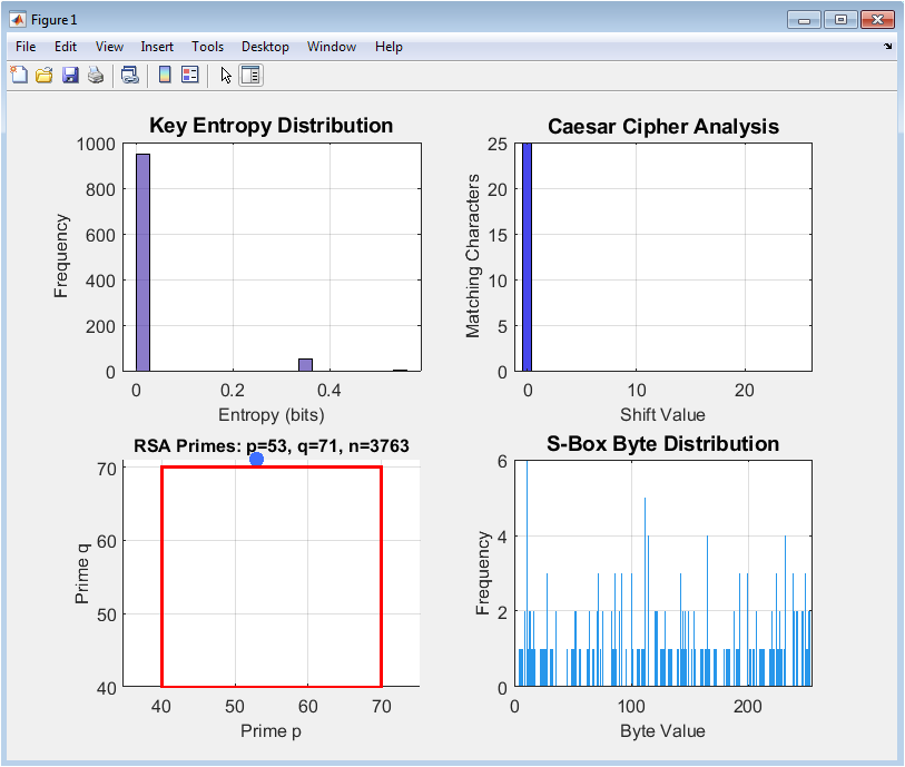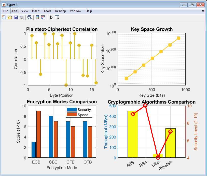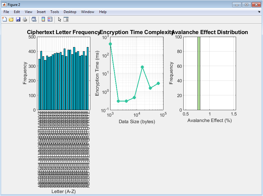 The simulation is executed as a cohesive workflow within the MATLAB environment, beginning with a standardized configuration for reproducibility and visual consistency. It systematically generates one thousand random cryptographic keys, each sixteen bytes in length, and calculates their Shannon entropy to quantify randomness. The tool then implements a classical Caesar cipher, testing all twenty-six possible shifts on a sample plaintext to visually demonstrate its vulnerability to exhaustive key search [24]. Following this, a simplified RSA public-key system is simulated by randomly selecting two distinct primes, computing the modulus and Euler’s totient function, and deriving valid public and private exponents. To analyze symmetric cipher components, the simulation creates a randomized substitution box and plots its byte distribution to assess nonlinearity and uniformity. A core cryptanalytic technique is applied by generating a long pseudorandom ciphertext and performing frequency analysis to reveal statistical patterns. Encryption time complexity is profiled by measuring the duration of a simulated XOR-based cipher across exponentially increasing data sizes, from one kilobyte to sixty-four kilobytes. The critical security property of diffusion is evaluated through one hundred trials that measure the avalanche effect, calculating the percentage of output bits that change after a single input bit is flipped. Correlation analysis is performed by encrypting one hundred plaintext blocks with a fixed key and computing the Pearson coefficient between corresponding plaintext and ciphertext bytes. The simulation further visualizes the exponential growth of the key space as a function of bit length and provides a comparative scoring of common encryption modes based on security and speed trade-offs. Finally, it synthesizes performance metrics for several major algorithms and conducts randomness tests, including autocorrelation and uniformity checks, on a pseudorandom sequence. Each analytical step produces dedicated, publication-quality figures, culminating in a comprehensive numerical summary of all cryptographic metrics derived from the simulation.