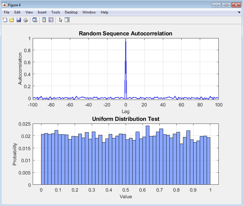 This final figure offers a high-level summary and validation. The first subplot is a dual-axis chart comparing the throughput (MB/s) and assigned security level of four cryptographic algorithms (AES, RSA, DES, Blowfish), clearly visualizing the performance-security trade-off, such as RSA’s high security but low speed relative to symmetric ciphers. The second part of the figure validates pseudorandom number generation. Subplot (a) displays the autocorrelation function of a generated sequence, showing near-zero correlation at all non-zero lags, which is a key property of randomness. Subplot (b) shows the probability histogram of the same sequence, confirming its uniform distribution, another essential requirement for cryptographic-quality randomness.