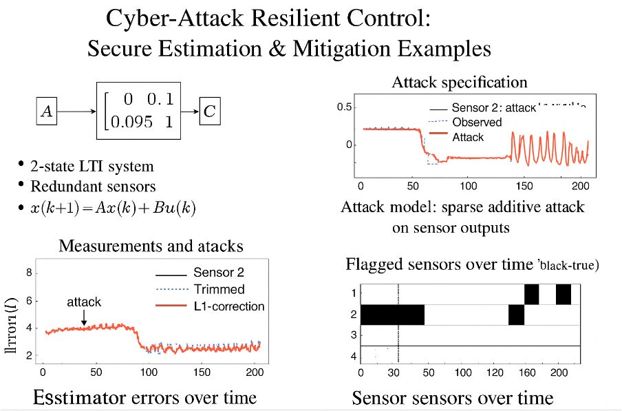 This study presents a comprehensive evaluation of secure estimation techniques for cyber-attack resilient control systems. Simulation results demonstrate that standard Kalman filtering is highly vulnerable to sparse sensor attacks. Principal Component Analysis can be employed for residual analysis and anomaly detection [24]. Trimmed-mean fusion provides moderate robustness by removing extreme outliers but has limitations under multiple attacks. L1-based sparse attack correction effectively identifies and mitigates malicious signals, maintaining accurate state estimation. Residual-based mitigation dynamically detects and excludes compromised sensors, ensuring stable performance even under persistent attacks. Quantitative error analysis confirms that sparsity-aware and residual-based methods outperform traditional approaches. Visualization of flagged sensors highlights the capability of real-time detection and attack isolation. Redundant sensor architectures combined with robust estimation significantly enhance system resilience. Lasso regression facilitates sparse recovery and attack isolation in measurement data [25]. These methods are suitable for critical cyber-physical applications such as power grids, autonomous systems, and industrial control. Overall, the integration of detection, mitigation, and robust estimation provides a reliable framework for secure state monitoring in hostile environments.