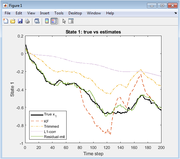 This figure shows how different estimators track the first state of the system during sensor attacks. The true state trajectory is plotted in black and serves as a reference for performance comparison. The standard Kalman filter deviates significantly whenever attacks occur because it equally trusts all corrupted sensors. The trimmed-mean estimator remains closer to the true trajectory by discarding extreme outliers caused by malicious injections. L1-based correction improves accuracy further by estimating and removing sparse attacks from the measurements. Residual-mitigation identifies suspicious sensors dynamically and excludes them, preventing false data from affecting the estimate. The figure highlights the sensitivity of the standard KF to malicious data. Overall, L1 and residual-mitigation methods demonstrate superior robustness during both attack and non-attack periods.
