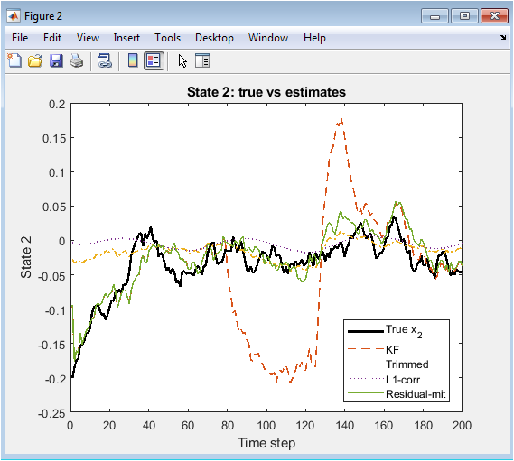 This figure illustrates the tracking performance for the second state variable across all estimation methods. As in Figure 1, the standard Kalman filter exhibits large deviations whenever sensor attacks are present. The trimmed-mean estimator maintains moderate robustness by averaging estimates from only trusted sensors. L1-based correction achieves improved accuracy by suppressing sparse attack disturbances using soft-thresholding. Residual-mitigation maintains stable performance by discarding flagged sensors based on abnormal residual statistics. During attack intervals, robust estimators outperform the standard KF significantly. Slight smoothing delays are observed in trimmed-mean due to averaging effects. Figure 2 confirms the necessity of redundancy-aware and sparsity-driven estimation for secure cyber-physical control.