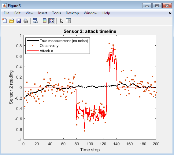 This figure visualizes sensor 2’s measurement, the injected attack, and the observed output over time. The black curve represents the true measurement without noise. Blue dotted points indicate observed measurements, which include both noise and attack signals. The red curve shows the attack signal introduced by the adversary. During the attack interval, observed measurements deviate noticeably from the true trajectory. This demonstrates the challenge faced by estimators that rely on raw sensor readings. It also shows how even subtle or intermittent attacks can destabilize classical filters. The figure emphasizes the importance of secure estimation techniques. Robust methods help to detect and correct such malicious deviations in real time.