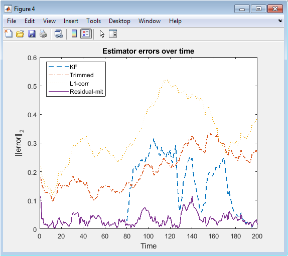 This figure compares the estimation errors of all methods over time using the 2-norm of the state error. The standard Kalman filter exhibits large error spikes during attack windows, highlighting its vulnerability to malicious sensor data. Trimmed-mean fusion reduces error but still shows fluctuations when attacks shift among sensors. L1-based correction suppresses error growth effectively by removing attack components at each time step. Residual-mitigation produces stable performance by excluding suspicious measurements before updating the state. Errors decrease immediately after attack intervals, showing estimator recovery. The figure provides a quantitative comparison, demonstrating that sparsity-based and detection-based methods consistently outperform the baseline KF. It confirms that robust estimation strategies are critical for cyber-attack resilient control.