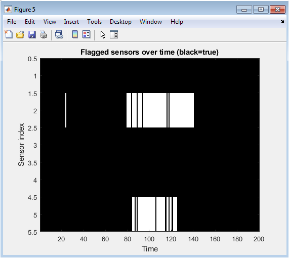 This figure displays a binary map indicating which sensors were flagged as suspicious over time by the residual-based mitigation strategy. Black entries mark moments when a sensor’s normalized residual exceeded the detection threshold. The flagged patterns correspond closely to the periods during which attacks were intentionally introduced. Sensor 2 and 5 show sustained flagged intervals, confirming accurate detection of persistent attacks. Sensor 3 shows a shorter flagged window, matching its brief secondary attack. The mitigation strategy uses this information to exclude corrupted sensors from the estimation process. Unattacked sensors remain largely unflagged, validating the detector’s accuracy.