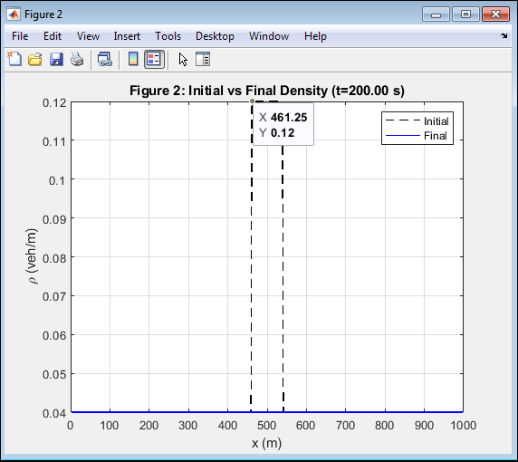 This figure compares the initial and final vehicle density distributions across the 1000 m domain. Initially, a bottleneck region at the center exhibits higher density than the surrounding free-flow zones. Over time, the congestion zone expands and shifts slightly backward, consistent with real traffic jam propagation. The MUSCL–HLL solver captures the transition sharply without introducing spurious oscillations. The difference between the dashed and solid curves shows the nonlinear evolution of density due to wave interactions. The accurate preservation of density bounds confirms the limiter’s effectiveness. This figure highlights the code’s fidelity to physical and mathematical conservation laws.
