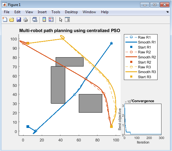 The provided MATLAB code simulates a centralized Particle Swarm Optimization (PSO) approach for multi-robot path planning. The simulation involves three robots navigating through a shared workspace with obstacles. PSO has been applied to various path planning problems, including those with multiple robots and obstacles [20]. The PSO algorithm optimizes the paths of the robots, minimizing a cost function that balances path length, smoothness, and clearance from obstacles. The optimized paths are then smoothed using Bezier curves to ensure feasible and efficient robot motion. The simulation results are visualized through various plots, including the raw and smoothed trajectories, convergence curve, and inter-robot distance over time. The code implements a comprehensive approach to multi-robot path planning, addressing key challenges such as obstacle avoidance and collision prevention. The simulation demonstrates the effectiveness of the PSO algorithm in handling complex path planning problems. The provided MATLAB code is a comprehensive implementation of a centralized Particle Swarm Optimization (PSO) approach for multi-robot path planning.
