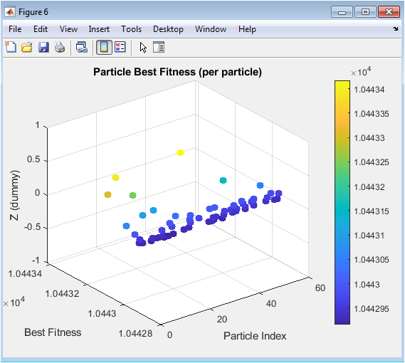 This figure shows the best fitness value of each particle in the swarm, represented by a scatter plot. The plot demonstrates the distribution of the particles’ fitness values, providing insight into the optimization process. The plot is a useful tool for evaluating the performance of the PSO algorithm. The particles’ fitness values are color-coded, providing a clear visualization of the distribution. The plot shows a clear distinction between the particles with good and poor fitness values. The legend provides a clear description of the plot elements. The plot is a useful tool for understanding the optimization process. The particles’ fitness values are a key indicator of the PSO algorithm’s performance.