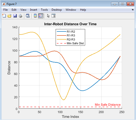 This figure shows the inter-robot distance over time, demonstrating the effectiveness of the PSO algorithm in preventing collisions between robots. The plot shows the distance between each pair of robots at each time step. The plot is a useful tool for evaluating the performance of the PSO algorithm. The inter-robot distance is a key indicator of the path planning process. The plot provides a clear visualization of the robots’ motion. The legend provides a clear description of the plot elements. The plot is a useful tool for understanding the path planning process. The inter-robot distance is a critical aspect of the path planning process.