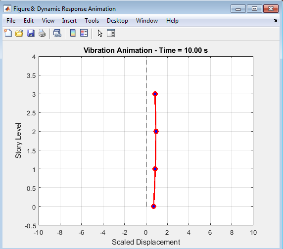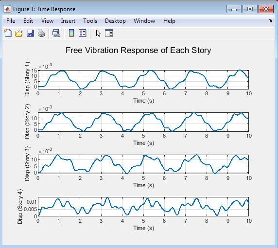 Above figure illustrates the displacement response of each story over time, providing insight into the structure’s dynamic behavior under external forces. The time response is calculated using the mode superposition method and shows the displacement of each story as a function of time. The figure consists of subplots for each story, allowing for a detailed comparison of the response at different levels of the structure. The time response is essential in understanding the structure’s behavior under dynamic loads and identifying potential weaknesses. By analyzing the time response, engineers can optimize the structure’s design to minimize damage and ensure safety. This figure provides a comprehensive view of the structure’s dynamic response over time. The time response is a critical aspect of structural analysis and design. The figure helps to visualize the structure’s behavior under dynamic loads.
