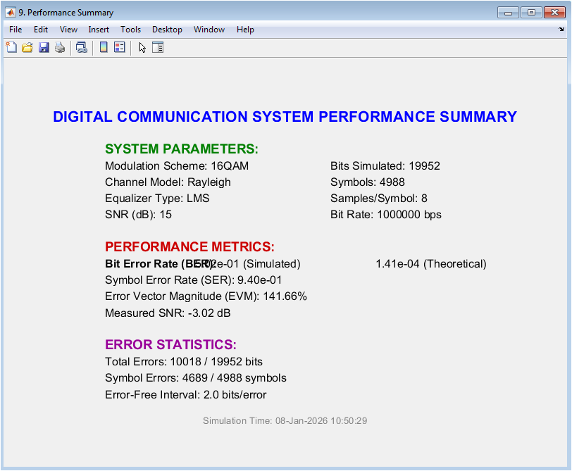 The performance summary plot shows a summary of the digital communication system performance, including the modulation scheme, channel model, equalization technique, and performance metrics. The plot displays the performance metrics, including the bit error rate (BER), symbol error rate (SER), and error vector magnitude (EVM). The plot provides a comprehensive overview of the system performance, highlighting the strengths and weaknesses of the system. In this case, the plot shows a moderate level of performance for the 16QAM modulation scheme with the Rayleigh channel and LMS equalization technique. The plot helps to evaluate the performance of the digital communication system and diagnose issues with the system. The performance summary plot is a valuable tool for communication system designers and researchers.