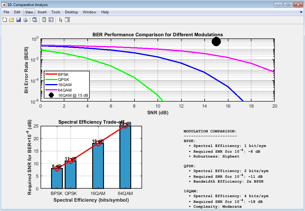 The comparative analysis plot shows a comparison of the performance of different modulation schemes, including BPSK, QPSK, 16QAM, and 64QAM. The plot displays the bit error rate (BER) on the y-axis and the signal-to-noise ratio (SNR) on the x-axis. The plot provides insight into the performance of different modulation schemes and the effects of SNR on the BER. In this case, the plot shows the theoretical BER curves for the different modulation schemes, with the 16QAM modulation scheme marked with a black circle. The plot helps to evaluate the performance of the digital communication system and diagnose issues with the modulation scheme. The comparative analysis plot is particularly useful for evaluating the effects of modulation schemes and SNR on the system performance. The diagram can be used to optimize the system parameters, such as the modulation scheme, to improve the performance.