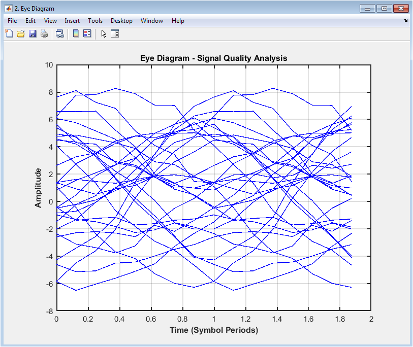 The eye diagram shows the received signal in the time domain, with the amplitude on the y-axis and time on the x-axis. The diagram displays the overlapping segments of the received signal, creating an “eye” pattern. The eye diagram provides insight into the signal quality, including the effects of noise, distortion, and intersymbol interference. In this case, the eye diagram shows a moderate level of noise and distortion, with some closure of the eye. The diagram helps to evaluate the performance of the digital communication system and diagnose issues with the signal quality. The eye diagram is particularly useful for evaluating the effects of channel impairments and equalization techniques on the received signal. The diagram can be used to optimize the system parameters, such as the equalizer coefficients, to improve the signal quality. The eye diagram is a valuable tool for communication system designers and researchers.