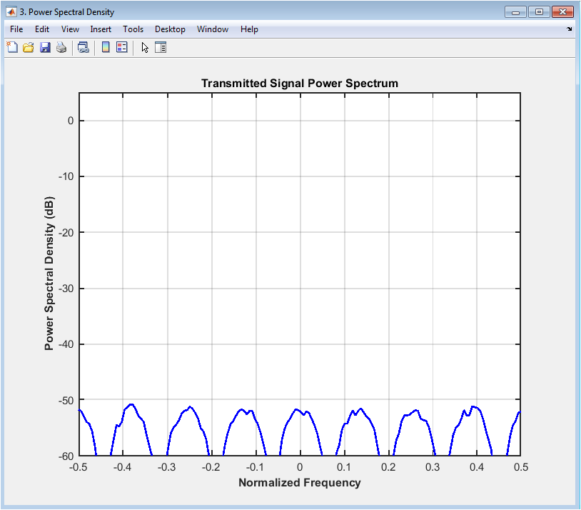 The power spectral density (PSD) plot shows the power distribution of the transmitted signal in the frequency domain. The plot displays the PSD of the transmitted signal, with the frequency on the x-axis and power on the y-axis. The PSD plot provides insight into the spectral characteristics of the signal, including the bandwidth and spectral efficiency. In this case, the PSD plot shows a moderate bandwidth and spectral efficiency for the 16QAM modulation scheme. The plot helps to evaluate the spectral characteristics of the signal and diagnose issues with the system. The PSD plot is particularly useful for evaluating the effects of modulation schemes and pulse shaping on the signal spectrum. The diagram can be used to optimize the system parameters, such as the pulse shaping filter, to improve the spectral efficiency. The PSD plot is a valuable tool for communication system designers and researchers.