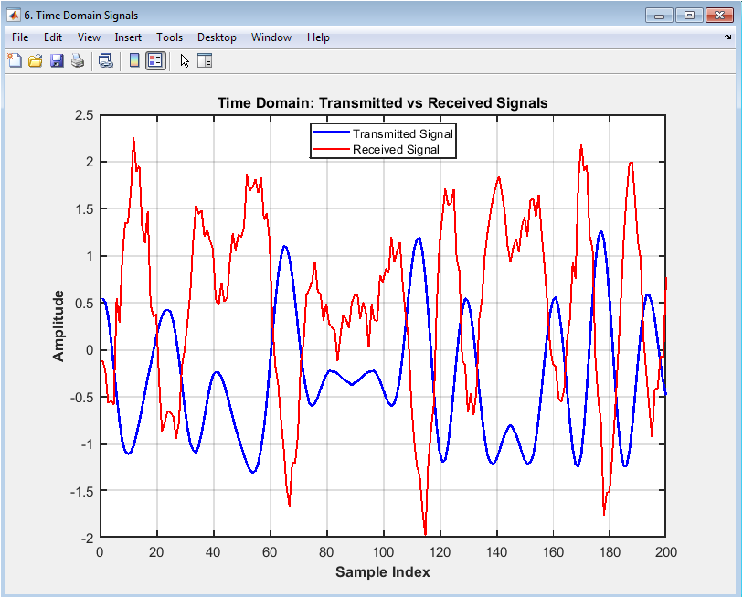 The time domain signal comparison plot shows the transmitted and received signals in the time domain, with the amplitude on the y-axis and time on the x-axis. The plot displays the transmitted signal in blue and the received signal in red. The plot provides insight into the effects of the channel on the received signal, including the effects of noise, distortion, and fading. In this case, the plot shows a moderate level of noise and distortion in the received signal. The plot helps to evaluate the performance of the digital communication system and diagnose issues with the signal quality. The time domain signal comparison plot is particularly useful for evaluating the effects of channel impairments and equalization techniques on the received signal. The diagram can be used to optimize the system parameters, such as the equalizer coefficients, to improve the performance.